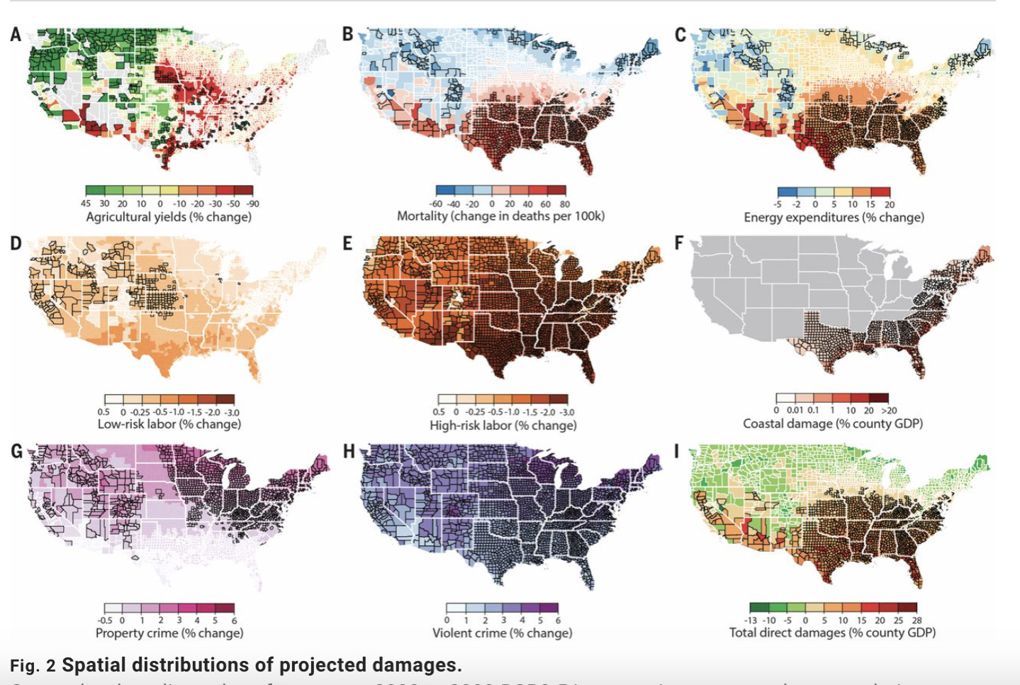Despite that skepticism, we find this paper promising for its county-specific level of analysis and what it indicates about the unequal distribution of damages that higher average temperatures and precipitation are likely to impose in the US. The authors created county-level projections of temperature and precipitation and tested their impact on various damage categories including agricultural yields, mortality, energy expenditure, low- and high-risk labor supply, coastal damage, property crime, and violent crime. Some categories have a nonlinear relationship with temperature rise and economic damages. For example, the impacts from temperature on energy expenditure and mortality both depend on the starting average temperature of the region. For colder climates, an increase in average temperature can improve mortality and cut energy expenditure, but create the opposite effect in hotter climates.